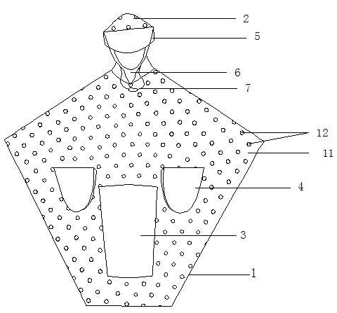 雨披本体的前片中间处有后视镜罩,后视镜罩由透明片材和含花式反光图案层的雨披主体面料拼接而成,雨披本体的前片下部有灯罩,灯罩为透明片材。
